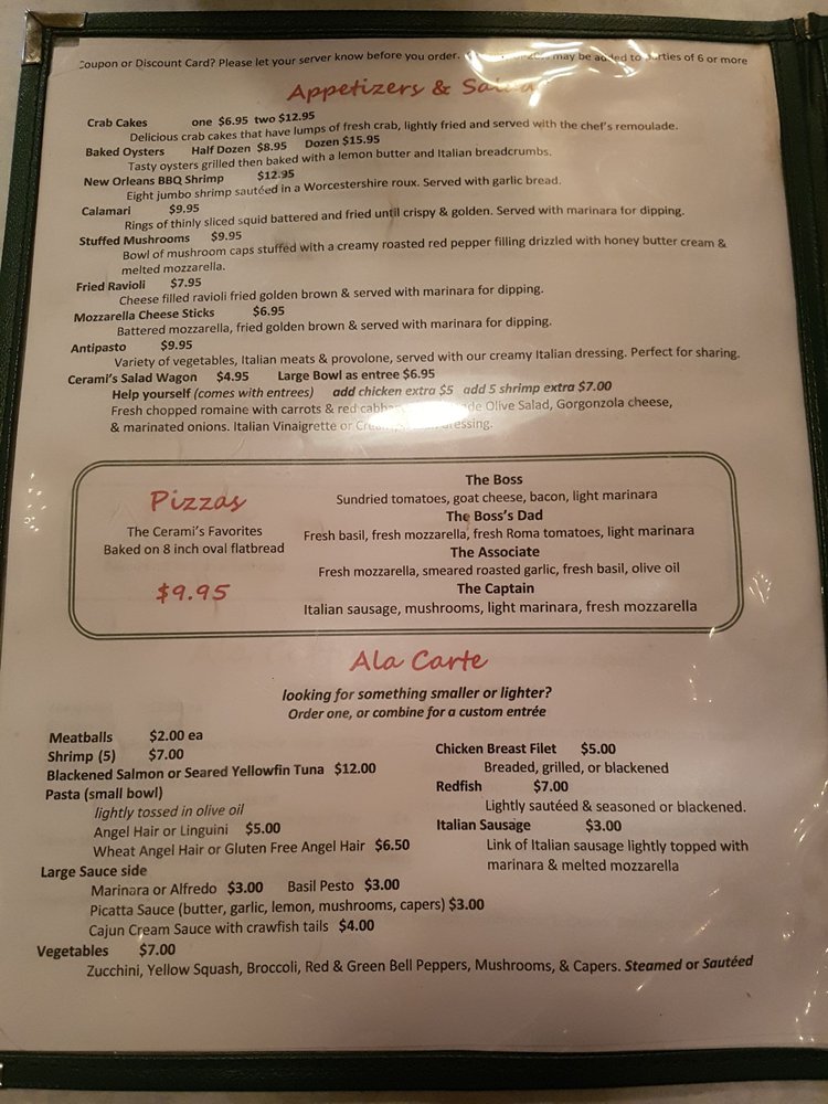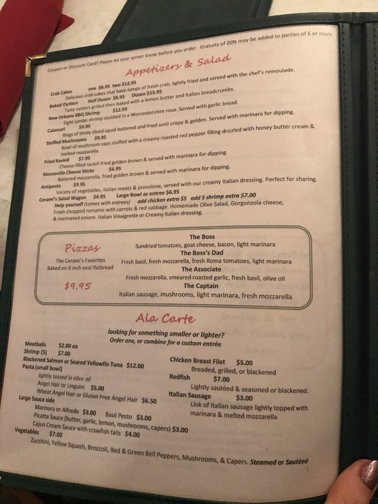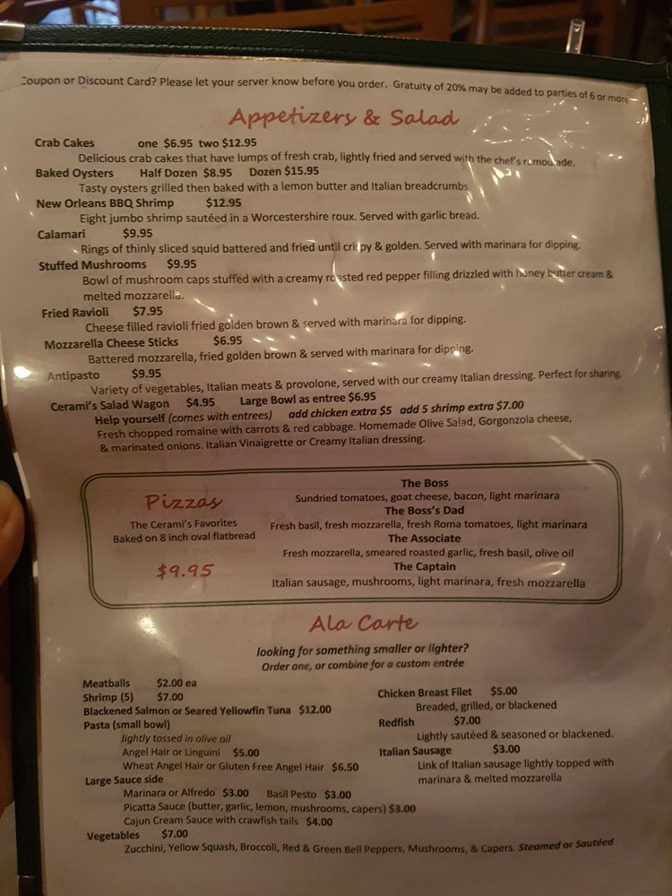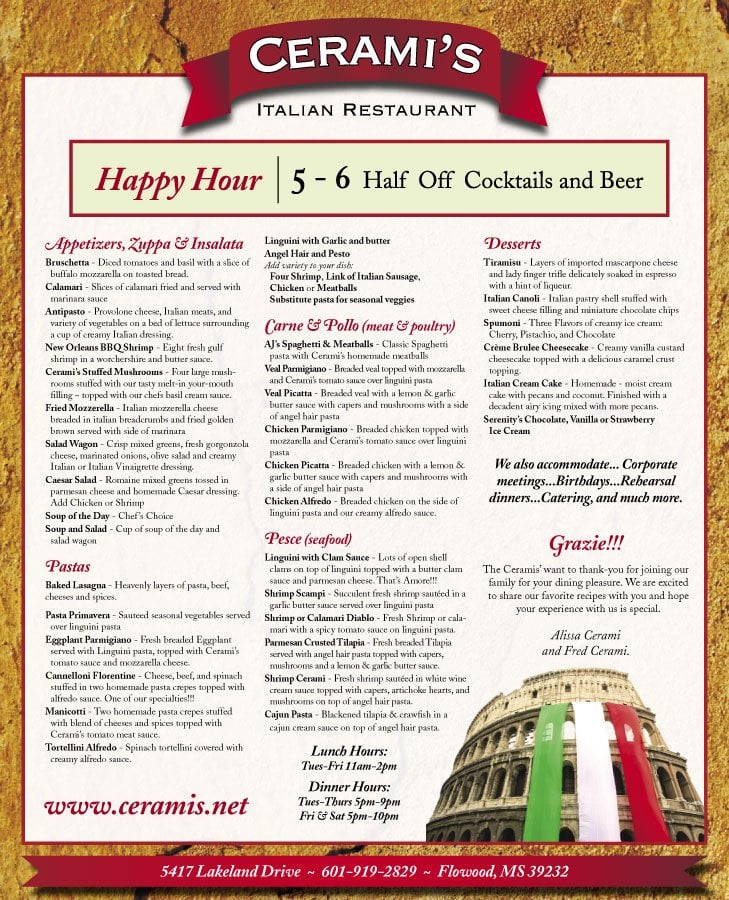 Welcome to Cerami's Italian Restaurant, where the essence of Italy comes alive right in Flowood. This charming locale offers a delightful blend of traditional Italian cuisine and a romantic atmosphere, perfect for intimate dinners, lively gatherings, or family outings. Guests rave about the lasagna, a must-try dish renowned for its rich flavor and generous portions. The pesto ravioli also receives high praise, embodying the restaurant's commitment to fresh ingredients.