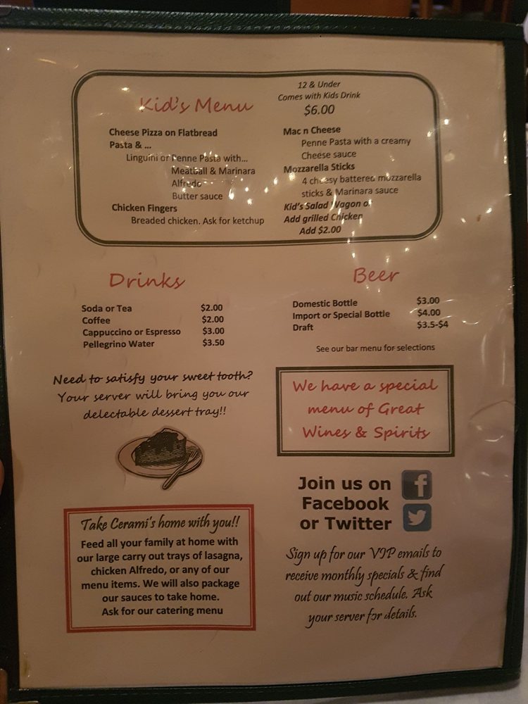 Cerami's not only provides an inviting ambiance enhanced by live music but also features a diverse menu that caters to various dietary preferences, including gluten-free options. Their full bar and happy hour specials add to the experience, making it a great spot for winding down after a long day. Whether you're enjoying outdoor seating or cozying up indoors, you’re sure to find a little taste of Italy that lingers long after your visit.
